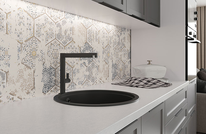 De keuken is voorzien van de greep F.412.056 AL, zwart, metaal, beschikbaar in de maten 128 mm of 224 mm.
