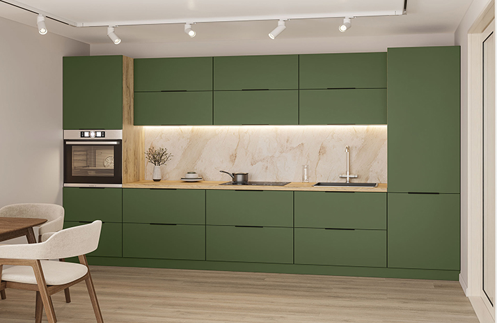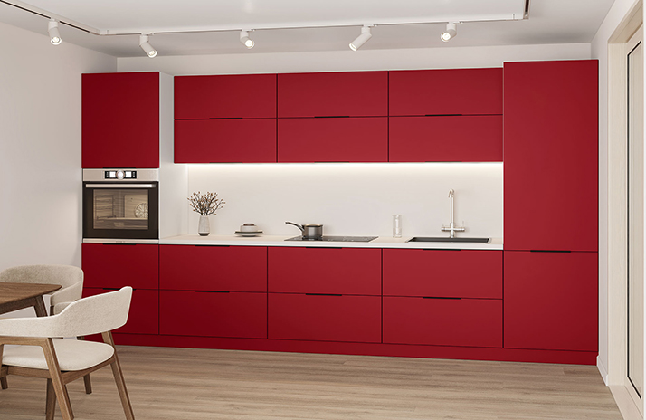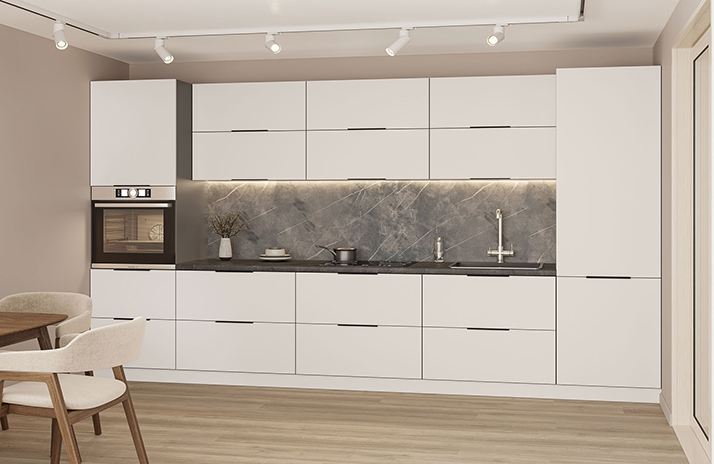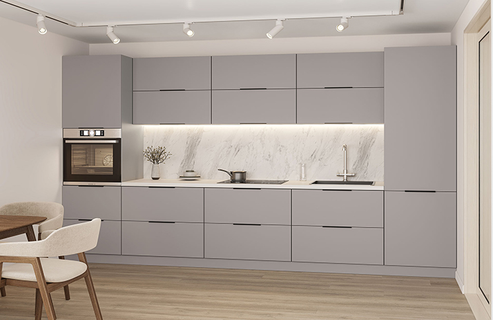 De keuken is uitgerust met een F.412.056 AL-greep, zwart, van metaal, met een keuzeoptie van 128 mm of 224 mm.