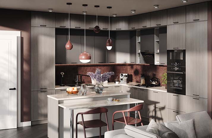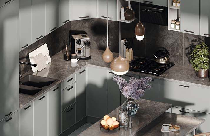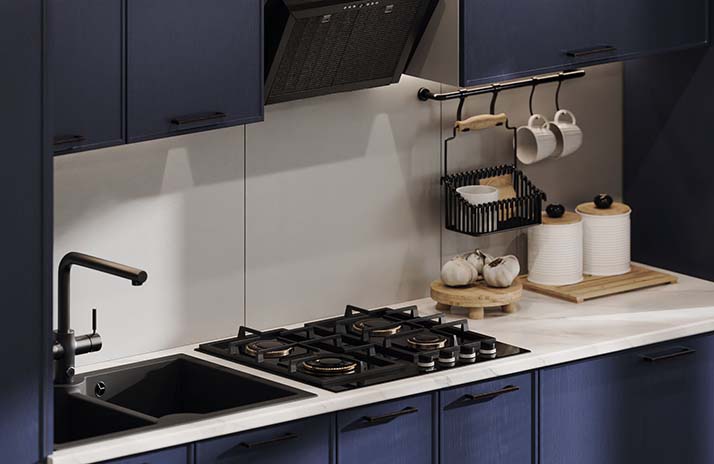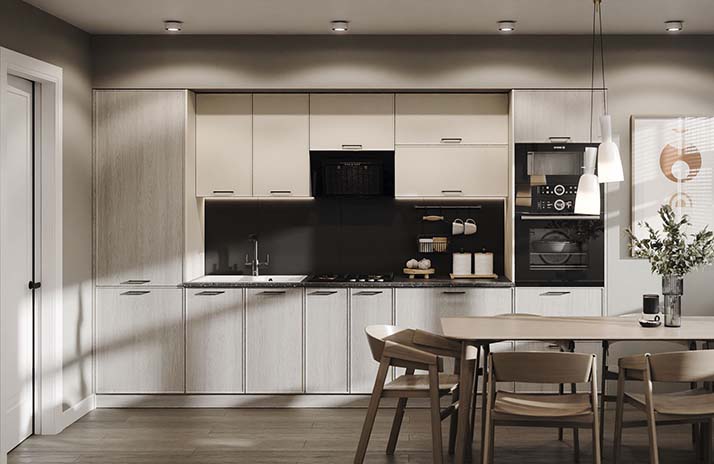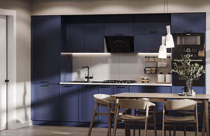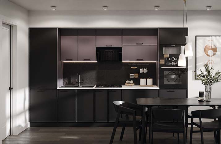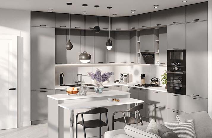 De fronten van de keuken zijn gemaakt van MDF in de kleuren: wit supermat, elegant zachtgrijs, zachte lavendel, Catalaans geel,