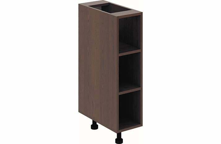 De zijpanelen zijn uitgevoerd in wit en kastanjekleur (spaanplaat). De voorkanten van de keuken zijn gemaakt van MDF