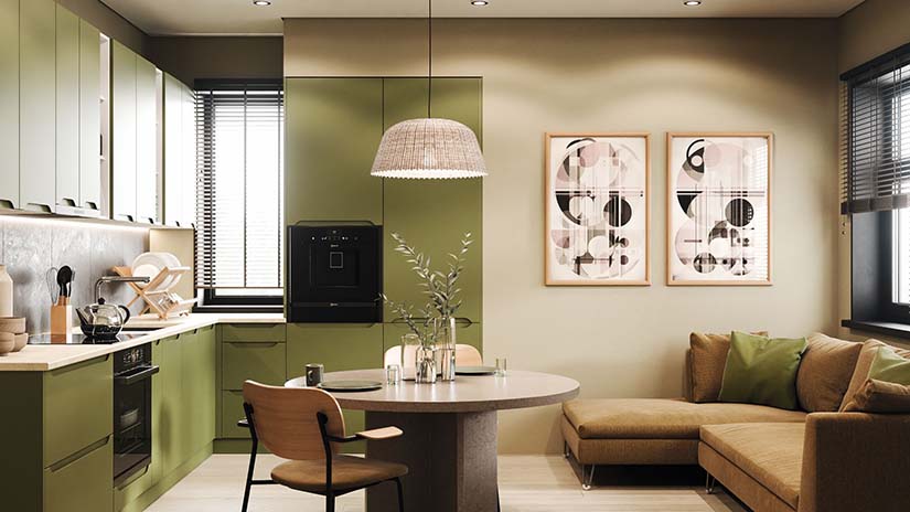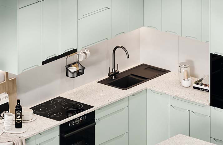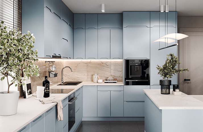 Keukenfronten zijn gemaakt van MDF in de kleuren witte zijde, ijs, ivoor, mocha, latte, grijs fluweel,